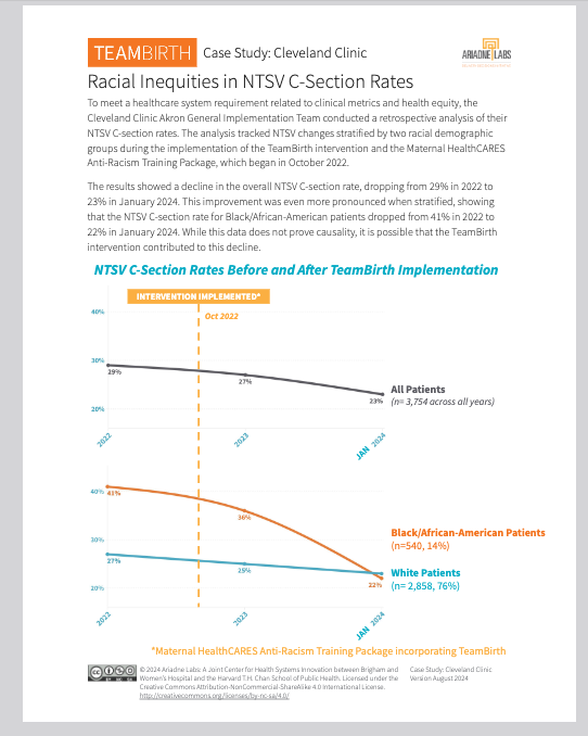 A retrospective analysis at one hospital — Cleveland Clinic Akron General — tracking NTSV cesarean rates before and after TeamBirth implementation in October 2022. Overall rate dropped from 29% to 23%. Black/African-American patients dropped from 41% to 22%.