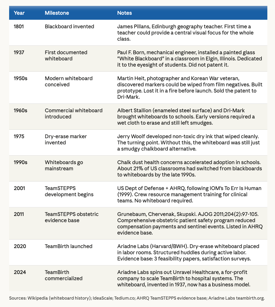 Ariadne Labs, a joint center of Brigham and Women’s Hospital and the Harvard T.H. Chan School of Public Health, has built something called TeamBirth. It involves structured huddles at the bedside during labor, documented on a patient-facing dry-erase board mounted in the labor room. The goal is shared decision-making. The pitch is patient safety. The evidence, as I will explain, is satisfaction surveys. And the business model is now, formally, a for-profit company.