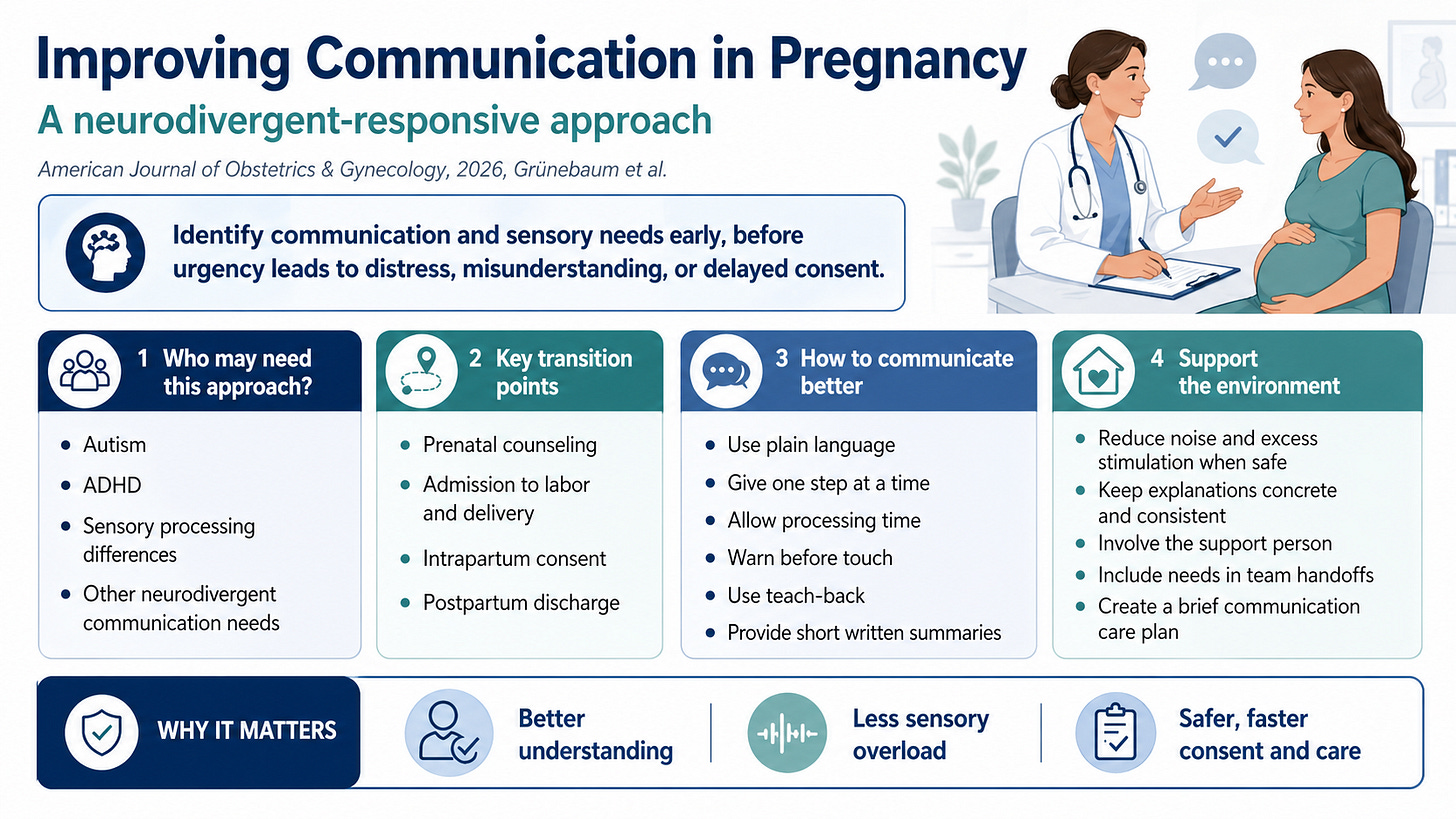Improving Communication in Pregnancy: A Neurodivergent-Responsive Approach, published in the American Journal of Obstetrics & Gynecology in 2026 by Grünebaum et al., argues that obstetric care must recognize communication and sensory processing differences before they become barriers during labor, consent, delivery, and postpartum care.
