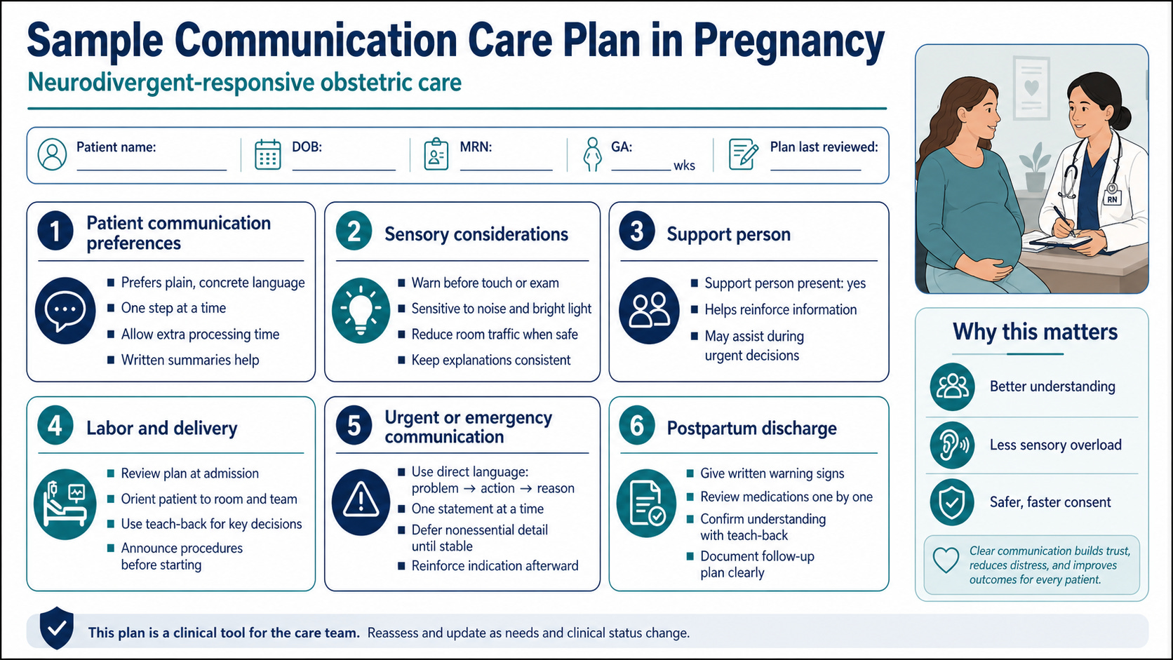 The proposed solution is practical. Clinicians should ask early about communication preferences, written versus verbal instructions, sensory triggers, processing time, warning before touch, and the role of a support person.