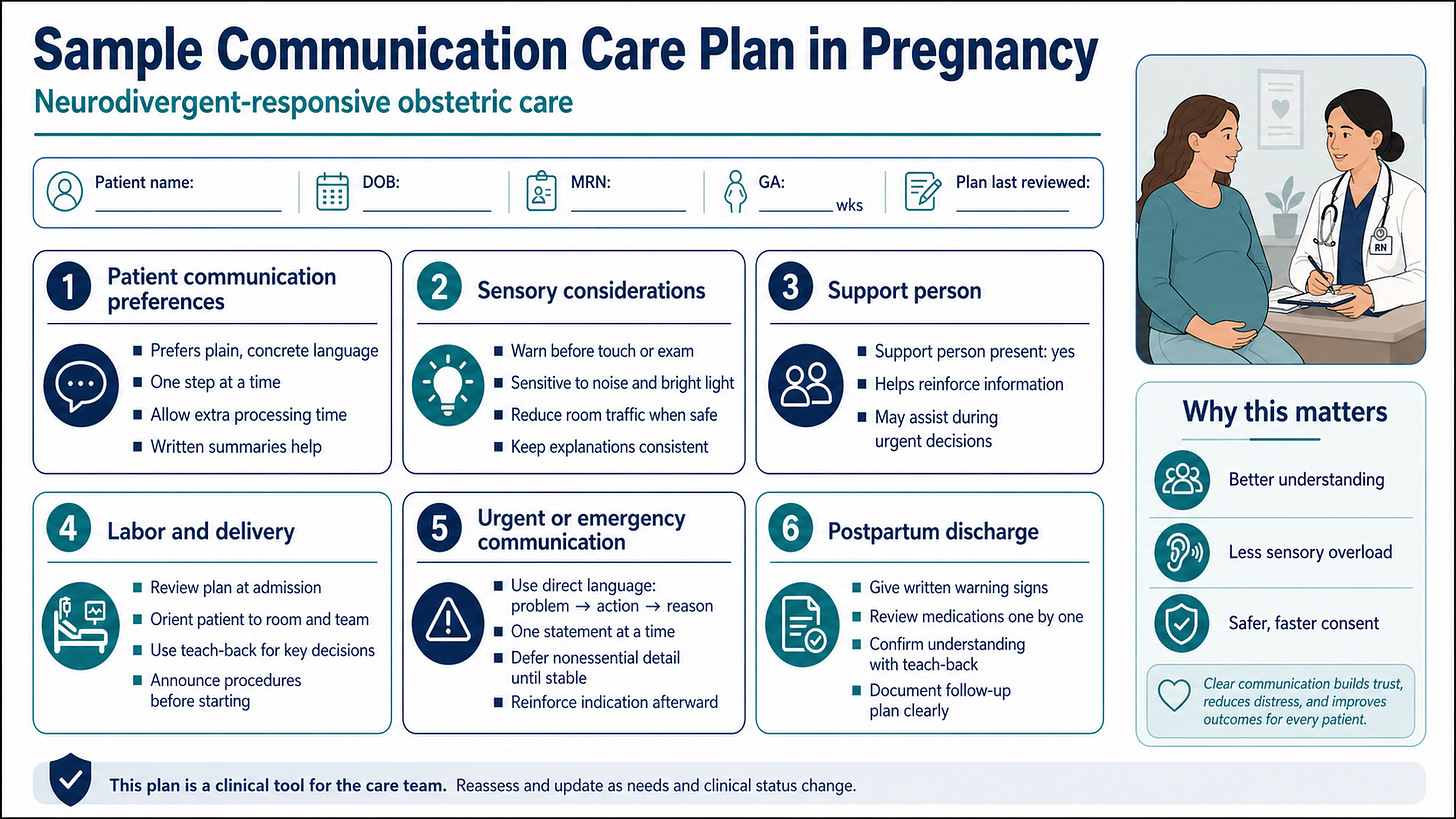 These needs should be documented in a brief communication care plan, visible to the labor and delivery team, and included in handoffs. During labor, clinicians should use plain language, give one instruction at a time, allow processing time, warn before examinations, reduce unnecessary stimulation when safe, involve the support person, and use teach-back to confirm understanding.