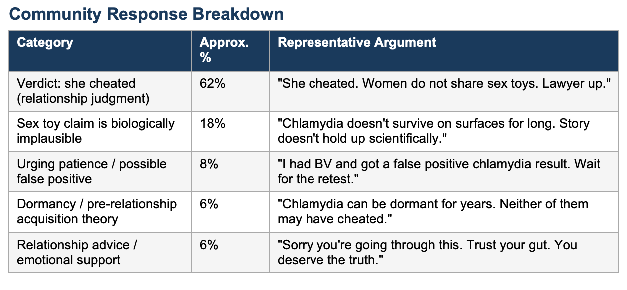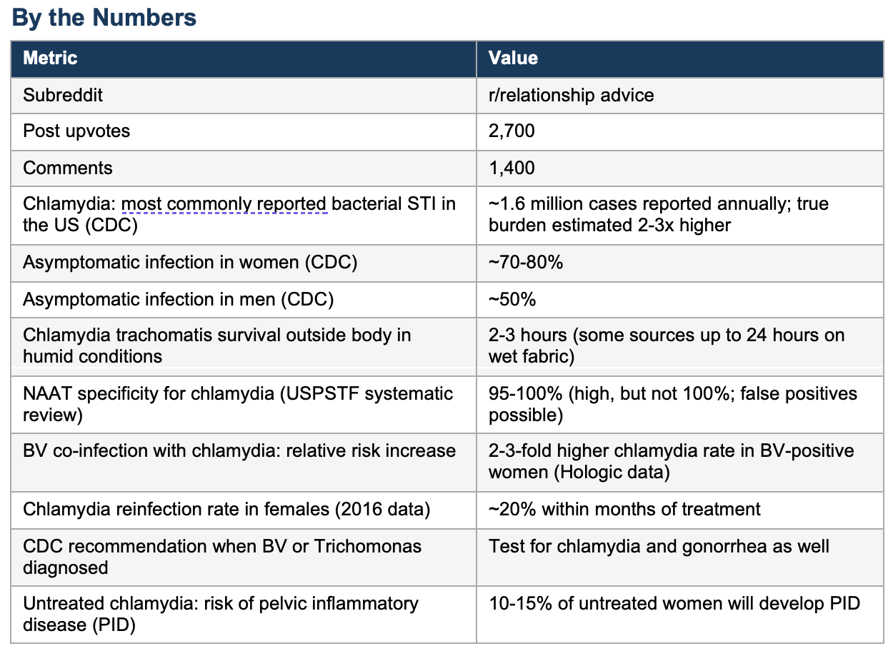 A 30-year-old man posted to r/relationship_advice after his wife tested positive for both bacterial vaginosis and chlamydia. The wife offered two possible explanations: her husband had been unfaithful, or she had contracted chlamydia by borrowing an unwashed sex toy from a female friend in December. The husband, who reported his own symptoms consistent with chlamydia, was awaiting his own test results. The post received 2,700 upvotes and 1,400 comments. What made this post clinically important was not the relationship drama -- it was the flood of biomedical misinformation that followed. Commenters confidently stated that BV cannot cause a false positive, that chlamydia cannot be transmitted via sex toys, and that dormancy lasting years is impossible. All three assertions are partially or completely wrong. The post is a window into how poorly the public understands chlamydia biology -- and how poorly we, as clinicians, have communicated it.