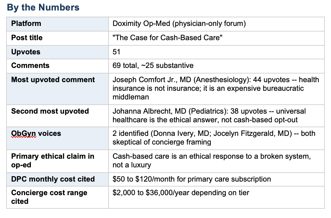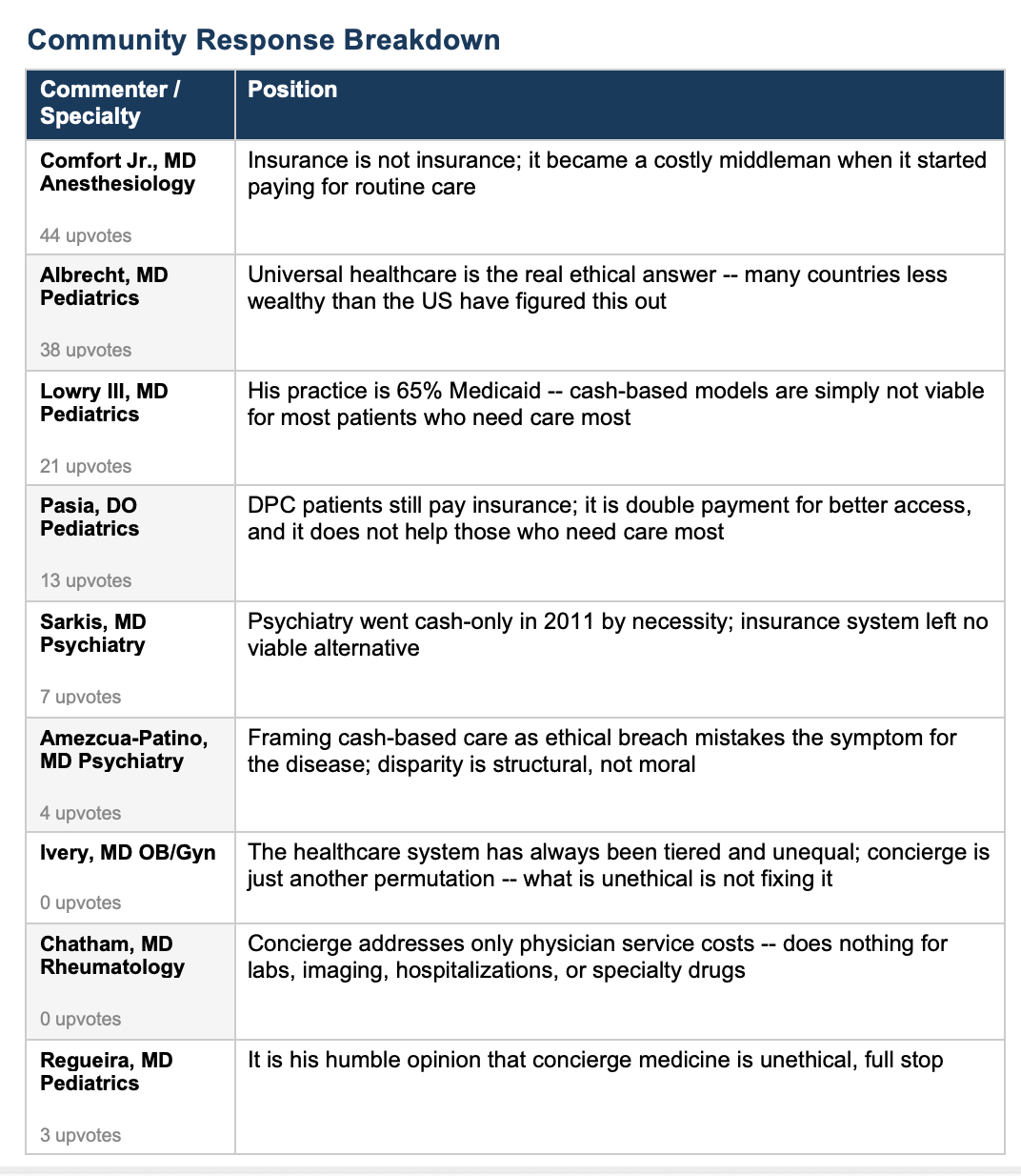 An Op-Med essay arguing that cash-based care is an ethical response to a broken system drew 69 comments and 51 upvotes from physicians across specialties. The arguments ran the full spectrum: libertarian (no one has a right to another’s labor), structural (insurance is the real villain), practical (DPC works for routine care, not for catastrophes), and moral (concierge medicine serves the privileged, abandons the rest).
