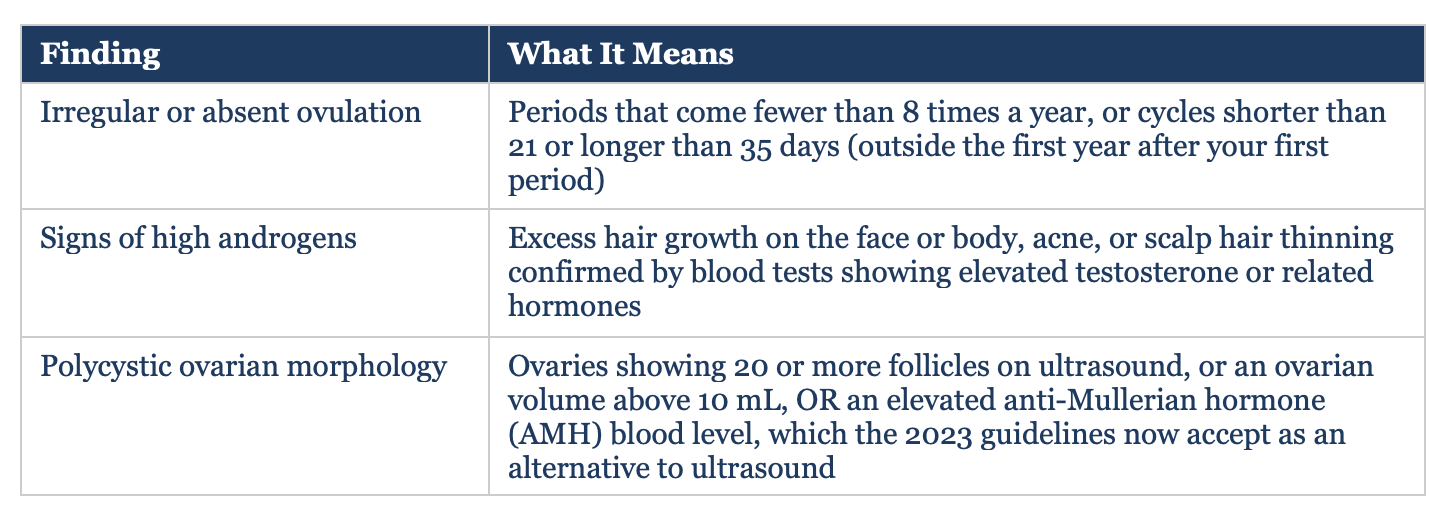 A critical point: having polycystic-looking ovaries on ultrasound alone does not mean you have PCOS. Up to 20% of women with completely normal cycles have ovaries that look polycystic on ultrasound. The word polycystic on your radiology report is not a diagnosis.