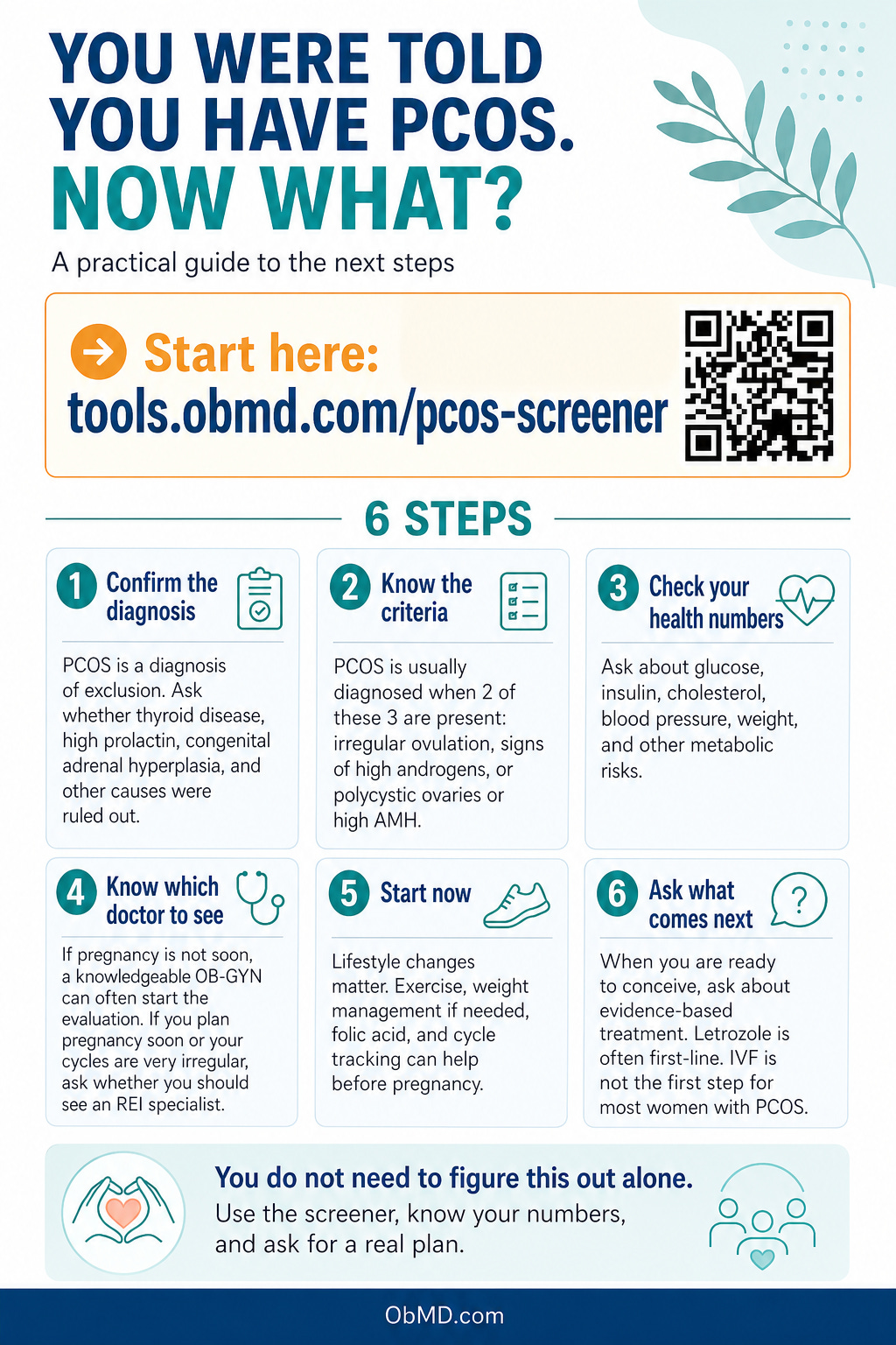 You can use the PCOS Screener at tools.obmd.com/pcos-screener to work through the Rotterdam criteria yourself before your appointment.”