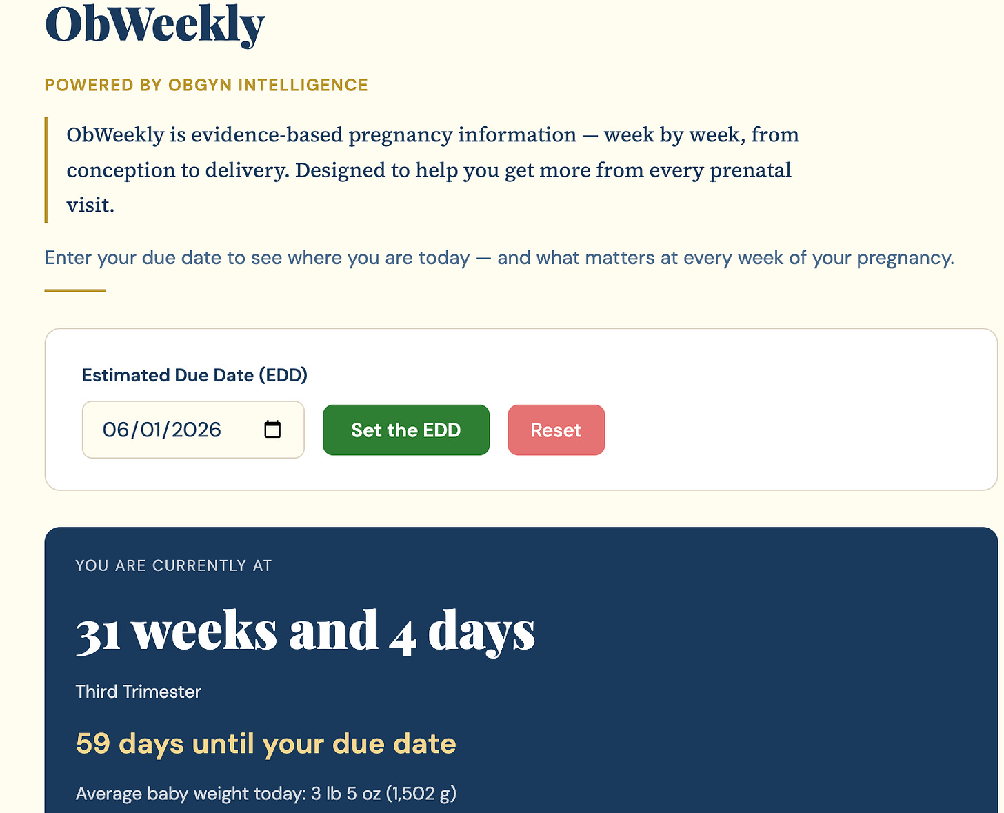 The ObWeekly Pregnancy Week-by-Week Calendar is a free, evidence-based clinical tool.